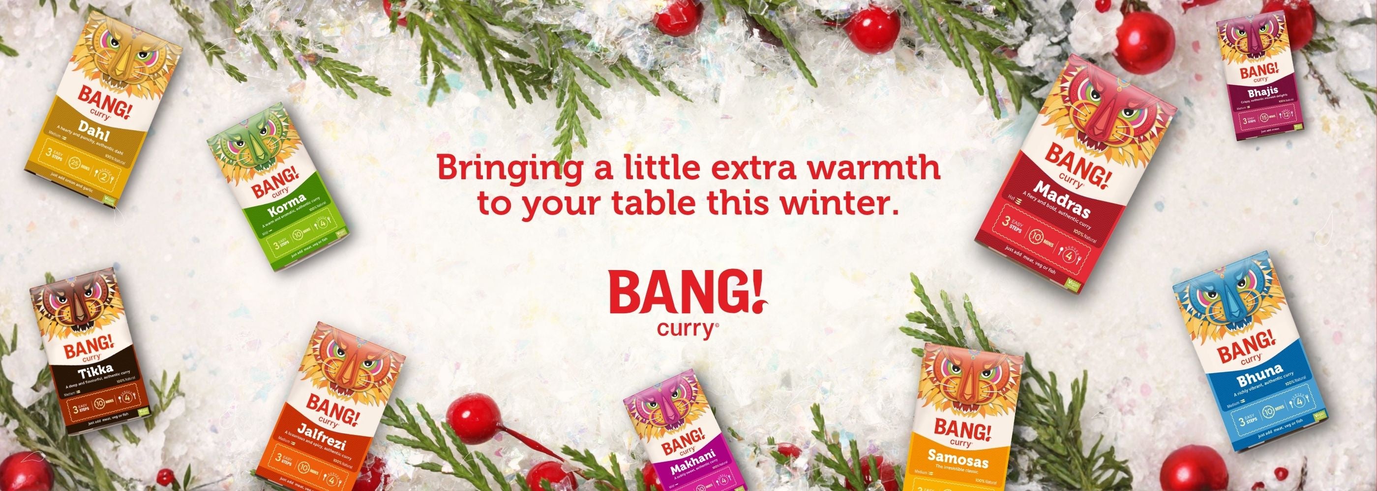 Each box contains Tikka Masala, Jalfrezi, Bhuna, Korma, Madras, Pakoras, Dahl and our classic Onion Bhajis.